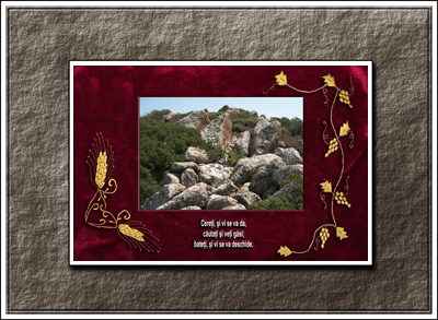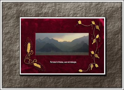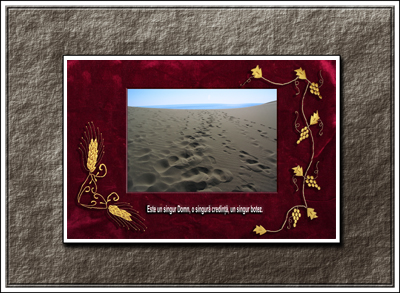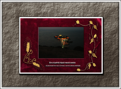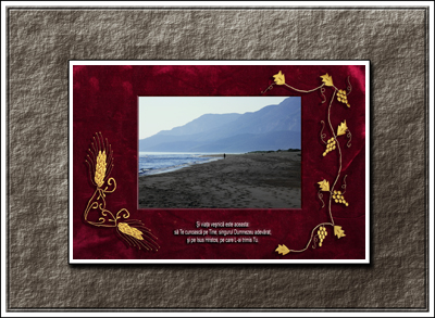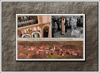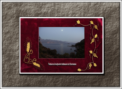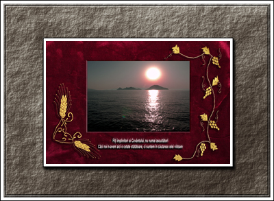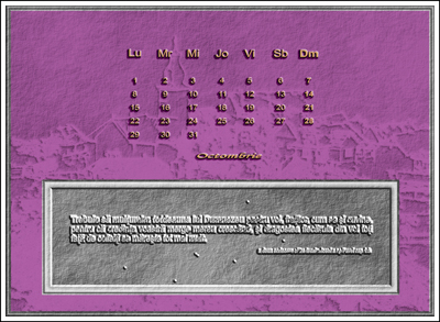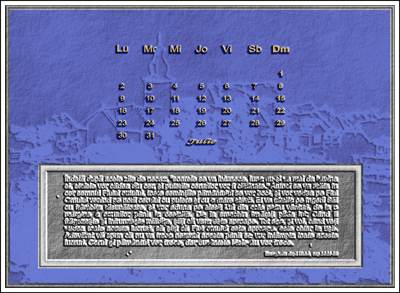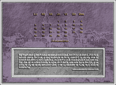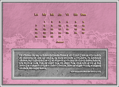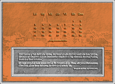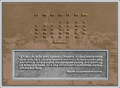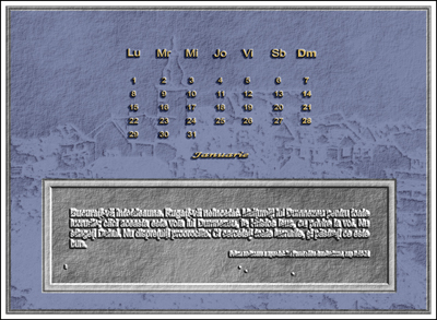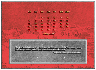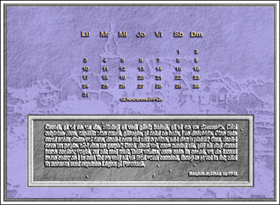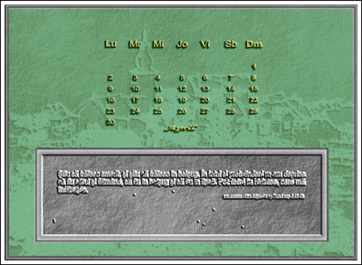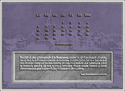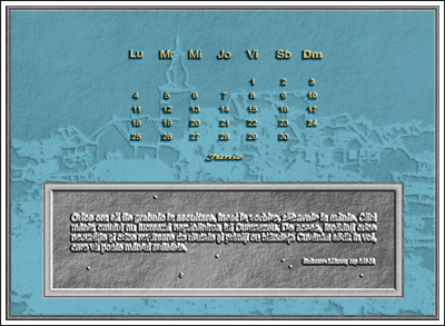 Calendar de birou cu vedere din ambele părți, cu 14 pagini mărime A5, tipărite față-verso, așezate pe suport cu secțiune longitudinal triunghiulară din carton special. Filele sunt legate prin spirală. Textele citate extrase din Noul Testament.