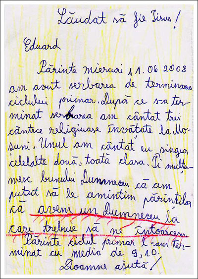Într-o discuție purtată cu Edi la ceva timp după serbarea sfârșitului de an, știind că el a trimis părintelui Cristian bilețelul pe care îl puteți vedea mai sus, l-am întrebat dece a scris în bilet "Îi mulțumim bunului Dumnezeu că am putut să le amintim părinților că avem un Dumnezeu la care trebuie să ne întoarcem." Recunosc, atunci când am pus această întrebare, nu mă așteptam la niciun fel de răspuns anume din partea sa. Cu toate că eram pregătit pentru orice răspuns, am fost impresionat de ceea ce am auzit. Întâi m-a făcut să înțeleg că datorită faptului că este doar un copil, nu poate influența pe orice om, așa cum o pot face oamenii mari, mai cu seamă cei influenți. Dar pe cine poate influența el sunt în primul rând părinții! Apoi a adăugat: "Eu vreau ca tot omul să nu sufere de necazuri și oricine să priceapă - chiar dacă este grea crucea sau ești apăsat de durere, după ploaie va răsări întotdeauna soarele"
