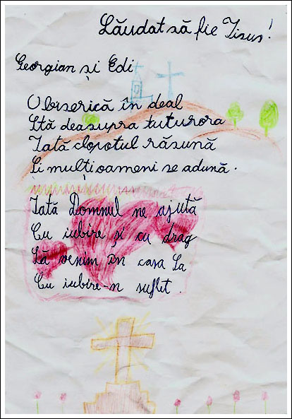 Doi copii exemplari în școlile lor, Georgian și Edi, sunt nelipsiți în Moșuni alături de părinții lor în fiecare zi de duminică. Datorită preocupării și râvnei lor pentru chestiunile de ordin spiritual, adesea compun poezii sau desene naive pe care le trimit la altar în zilele de duminica. Una dintre aceste creații ale lor este poezia trimisă în dimineața duminicii de 17 mai 2008, care poate fi văzută alăturat.