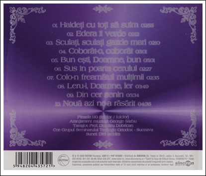 Drepturi de autor și producție 2008 ROTON Romania. 4357-2 RNF 072325. Distribuit de SINCRON Str Traian nr. 59-61 sector 2 București. Tel. 021-323.49.62, 021-321.68.40, 0232-230.377, www.roton.ro, www.discomania.ro; Tipărit la Casa de Editură Venus. RO6608270. Toate drepturile producătorului și ale autorilor sunt rezervate. Utilizările neautorizate ale aceste înregistrări prin copiere, împrumut, prezentare publică sau transmitere radio și TV sunt strict interzise și se pedepsesc conform legii.