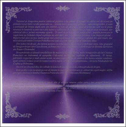 Nu este un obișnuit disc de colinde în lumea de azi invadată de atâtea producții de gen. Este un disc care ne ajută pe toți să intrăm în starea de sărbătoare și, alături de copii noștrii, să fim iar copii cinstind în lumină "Nașterea Pruncului Iisus".